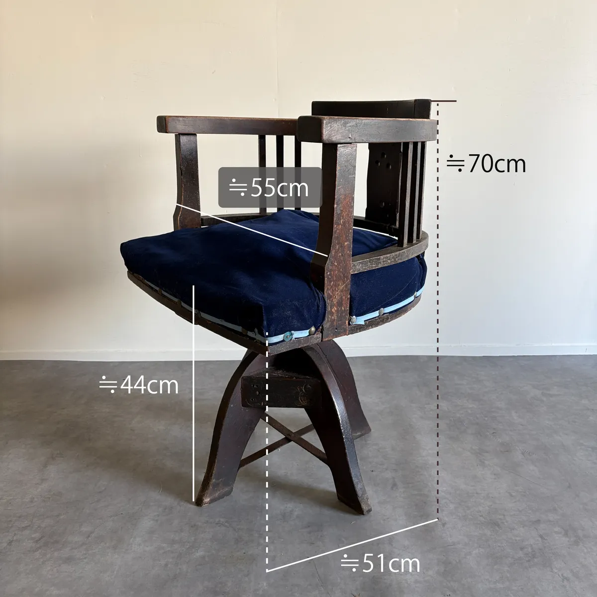 アンティークならではの風合いが感じられる一脚です。長い年月を経て使い込まれており、木部や佇まいから当時の雰囲気が伝わってきます。