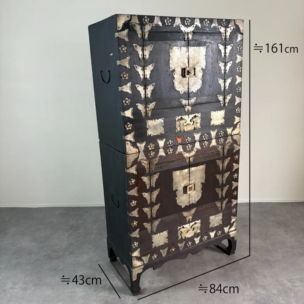地域別送料(家財おまかせ便)重厚な木製本体に、蝶や花の装飾金具が贅沢にあしらわれた収納家具です。(上下に分かれます)