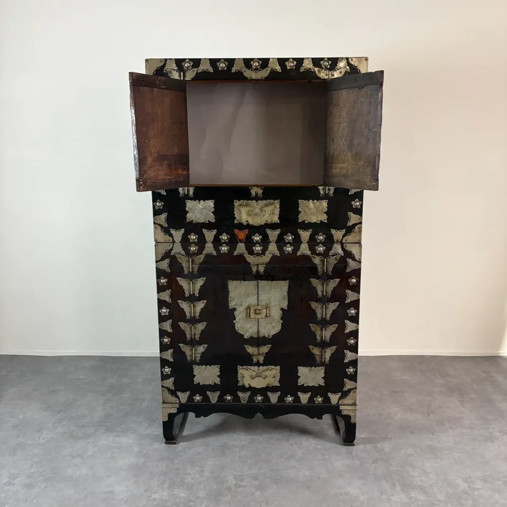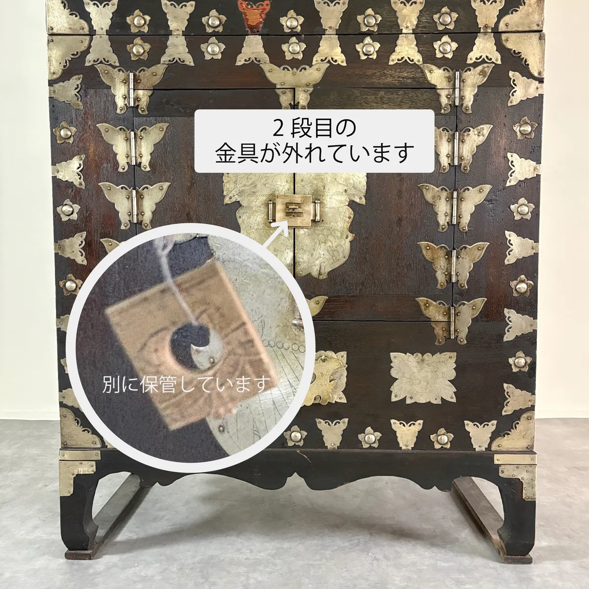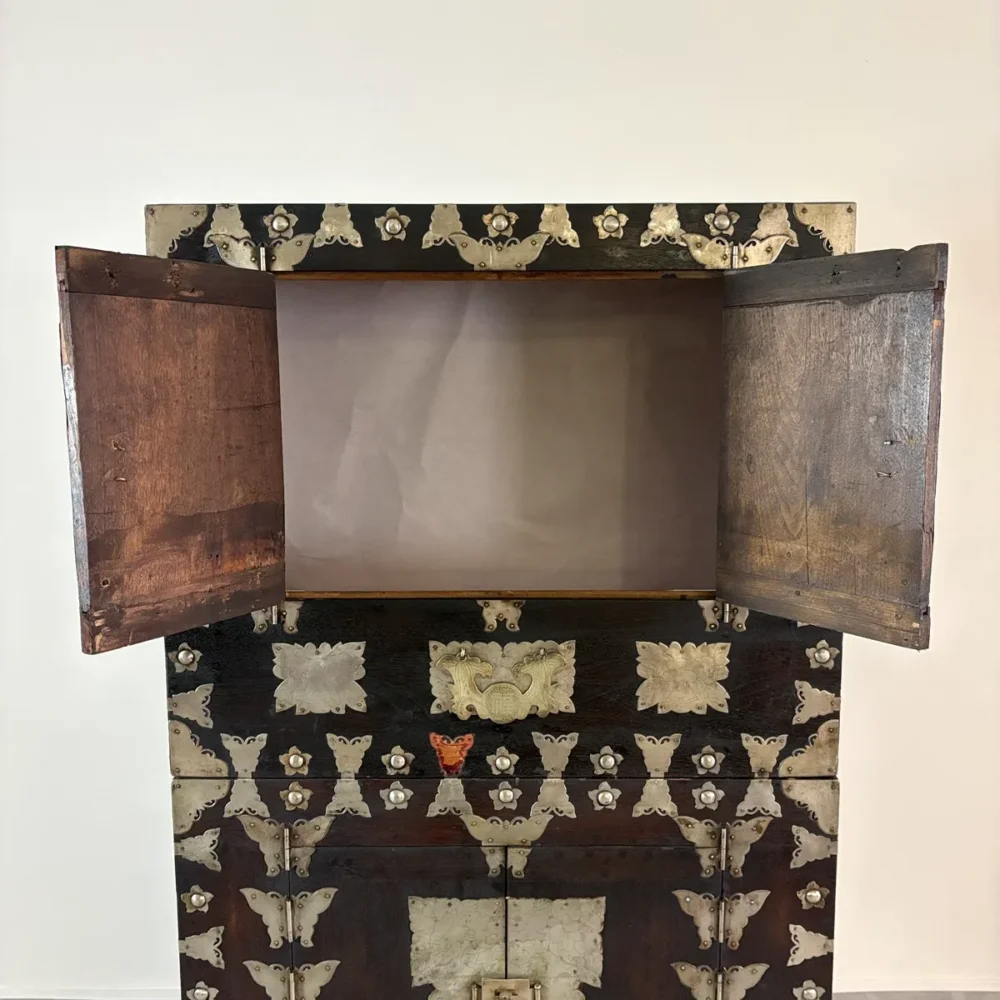 これらの金具装飾は、韓国の伝統家具様式「李朝」に見られる意匠を彷彿とさせるもので、李朝時代より現代に至るまで脈々と受け継がれてきた装飾文化を感じさせます。