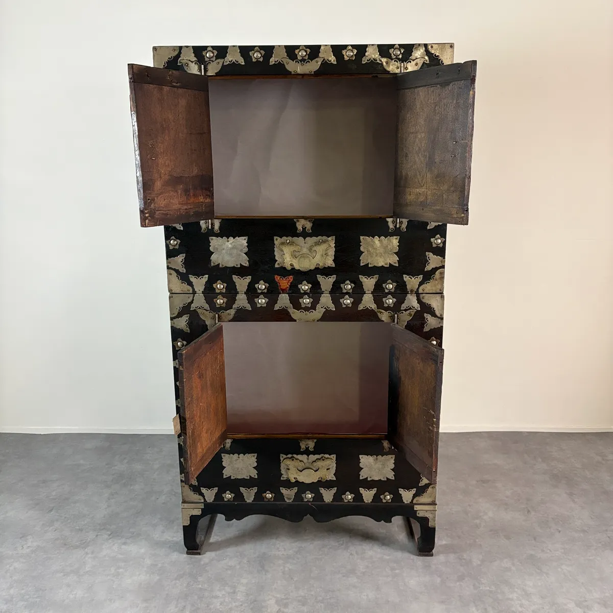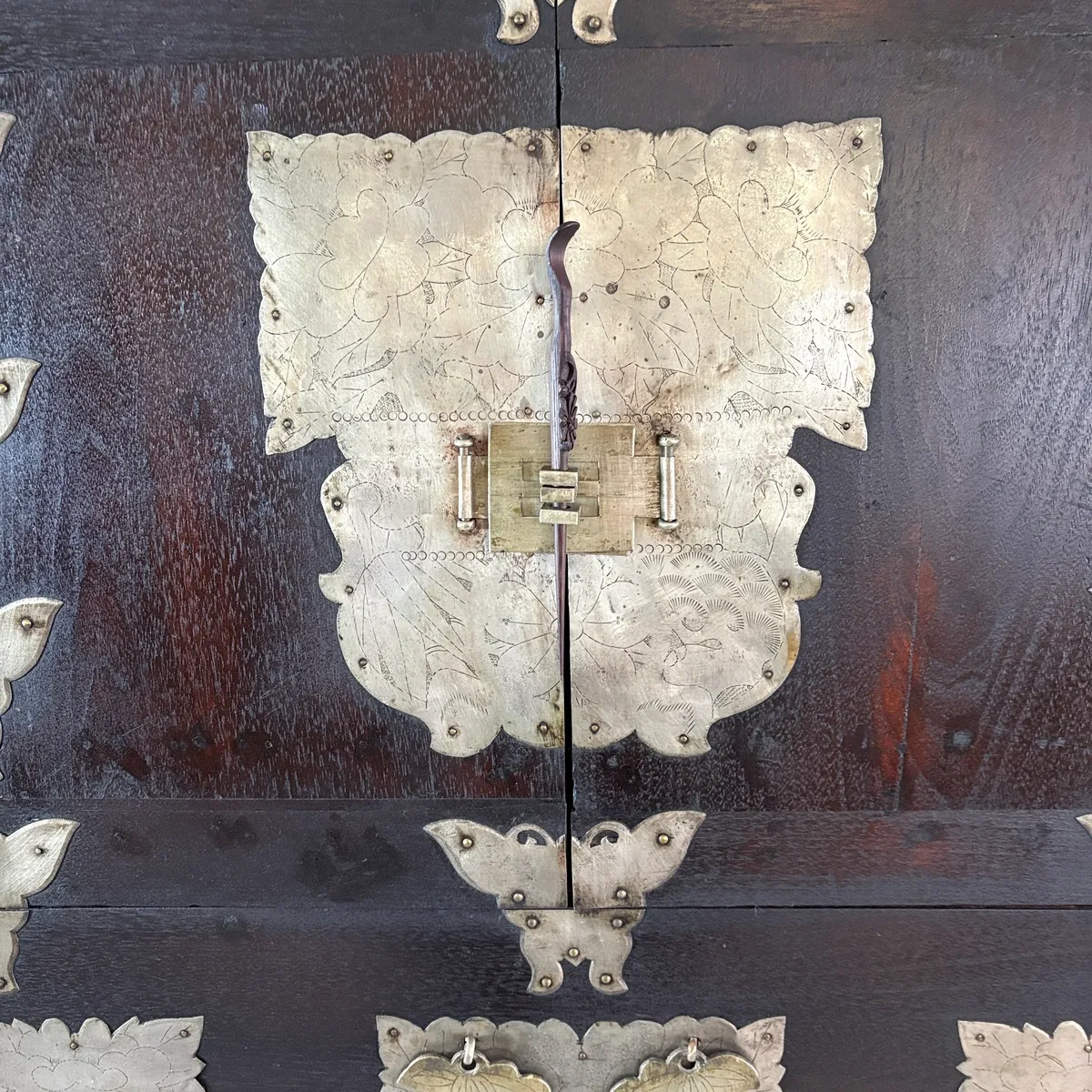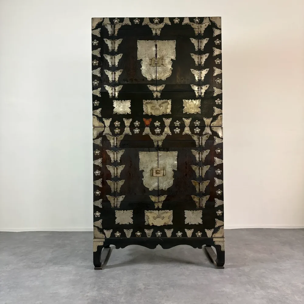 これらの金具装飾は、韓国の伝統家具様式「李朝」に見られる意匠を彷彿とさせるもので、李朝時代より現代に至るまで脈々と受け継がれてきた装飾文化を感じさせます。