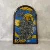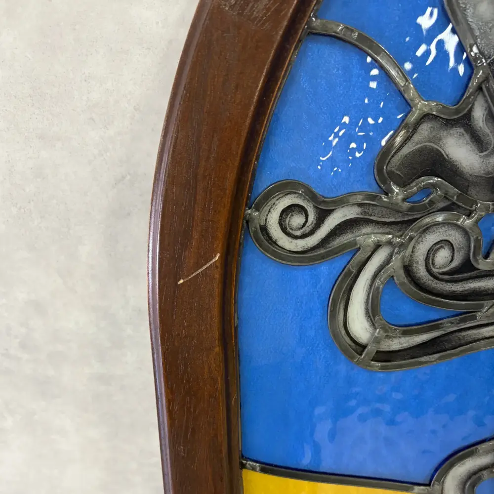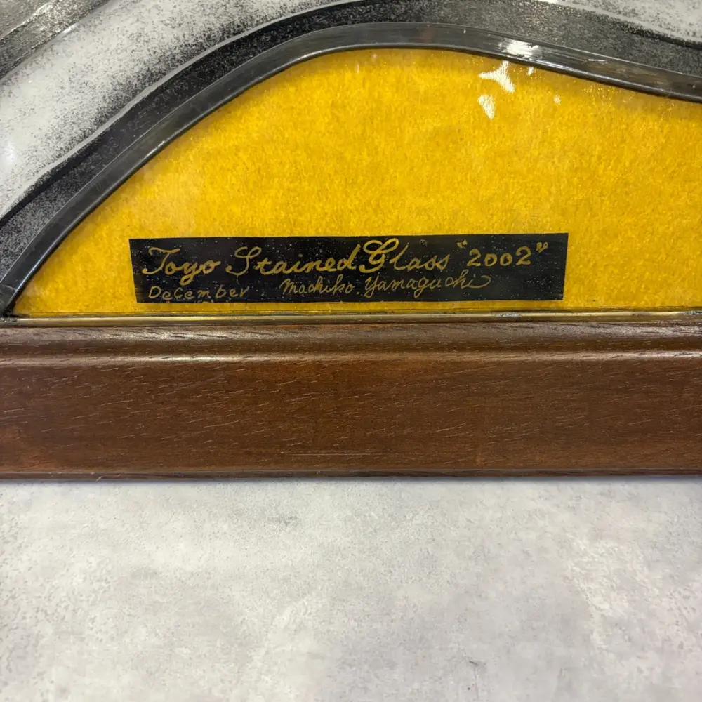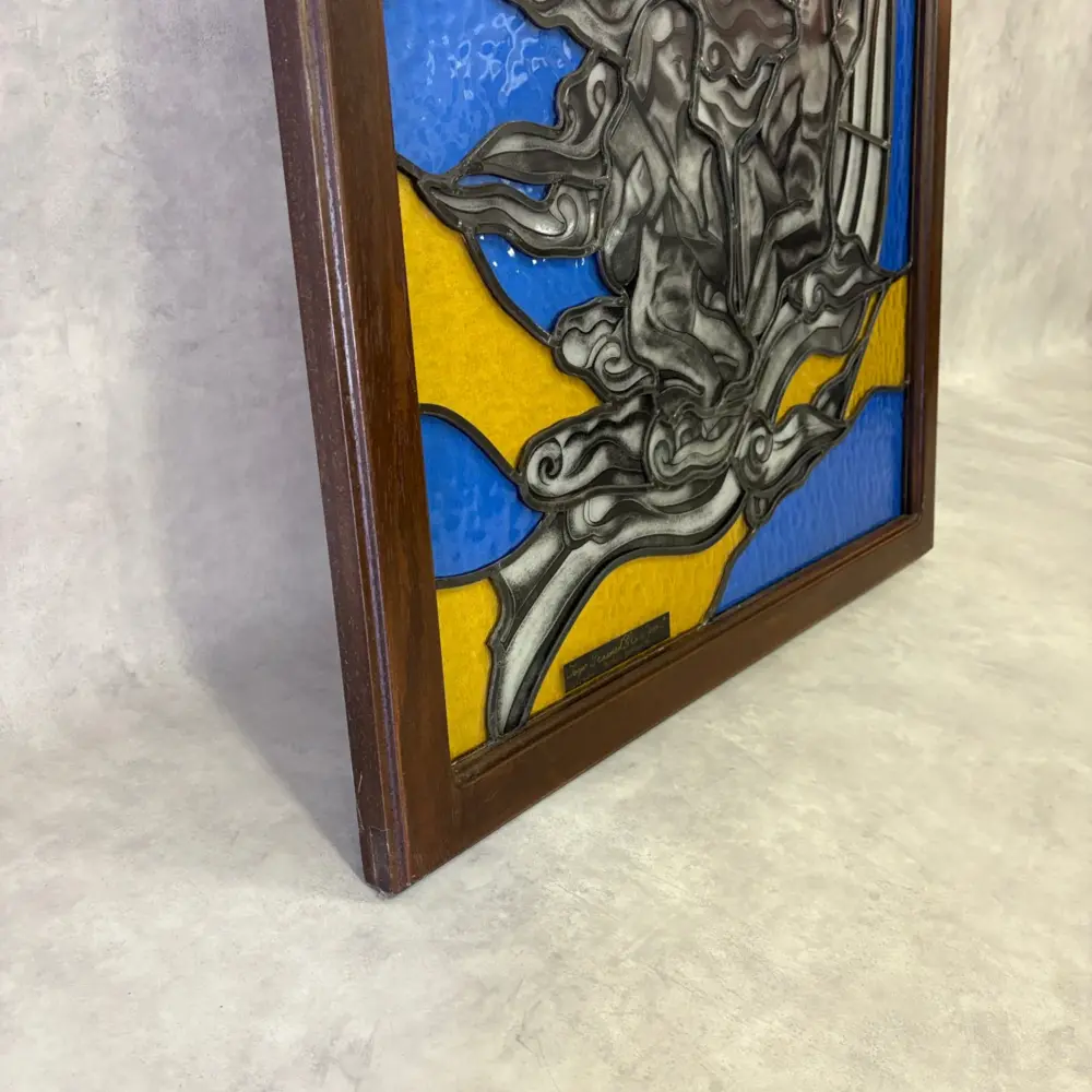 本作品は、繊細なガラス片の縁に銅箔を巻き、ハンダで丁寧に接合する「ティファニー技法」によって制作されており、曲線や表情の細やかな表現が可能となっています。