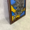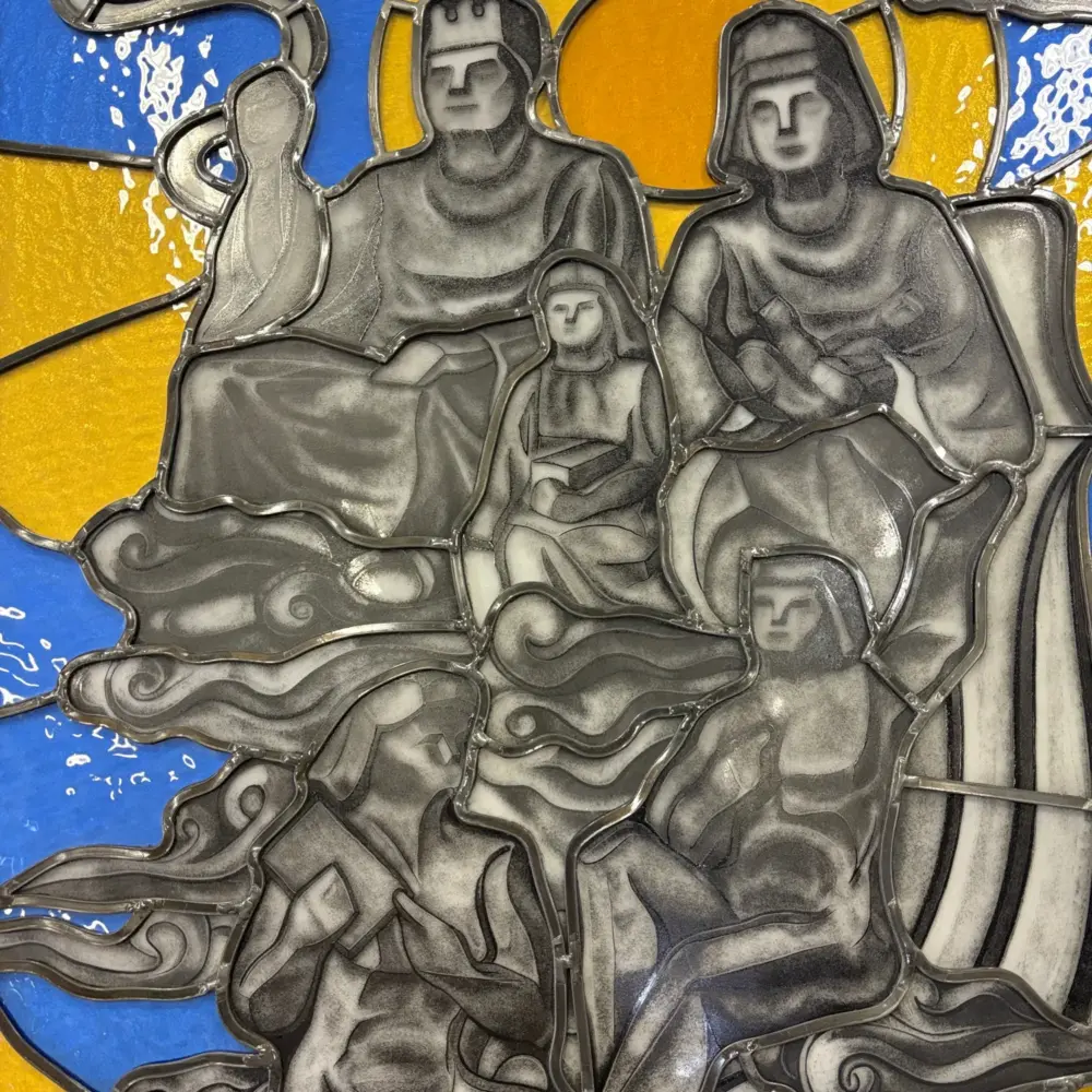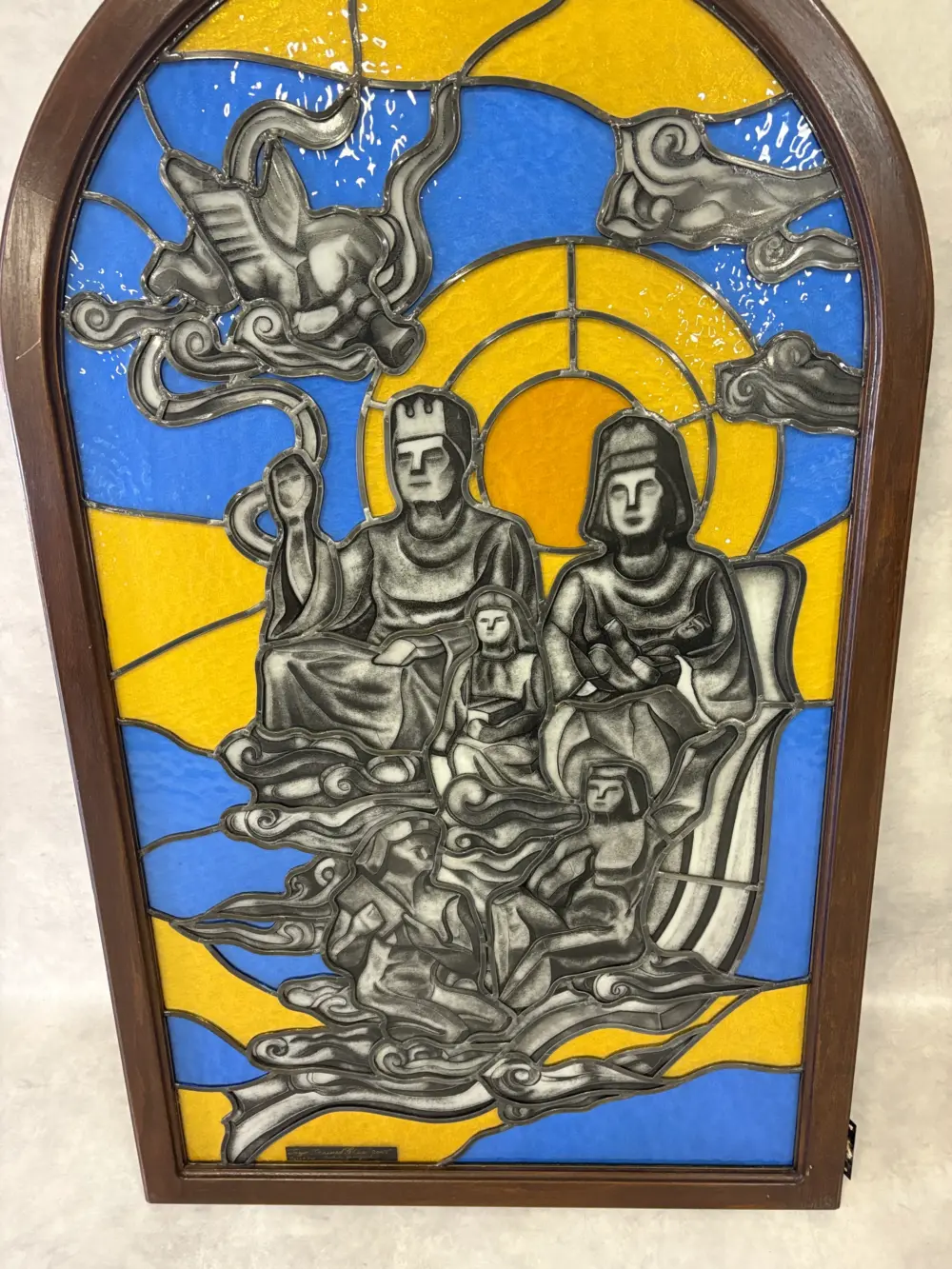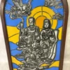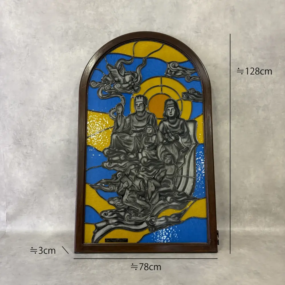 地域別送料(家財おまかせ便)福岡県にある東洋ステンドグラス株式会社で制作されたステンドグラスです。 高さが130㎝弱あります。 「聖家族(マリア・イエス・ヨセフ)」を中心に、天上での祝福や昇天の光景を表したステンドグラスデザイン 背景は 黄色と青 の鮮やかなストライプで、「太陽の光(神の光)」や「天(天国)」を表す典型的な配色です。