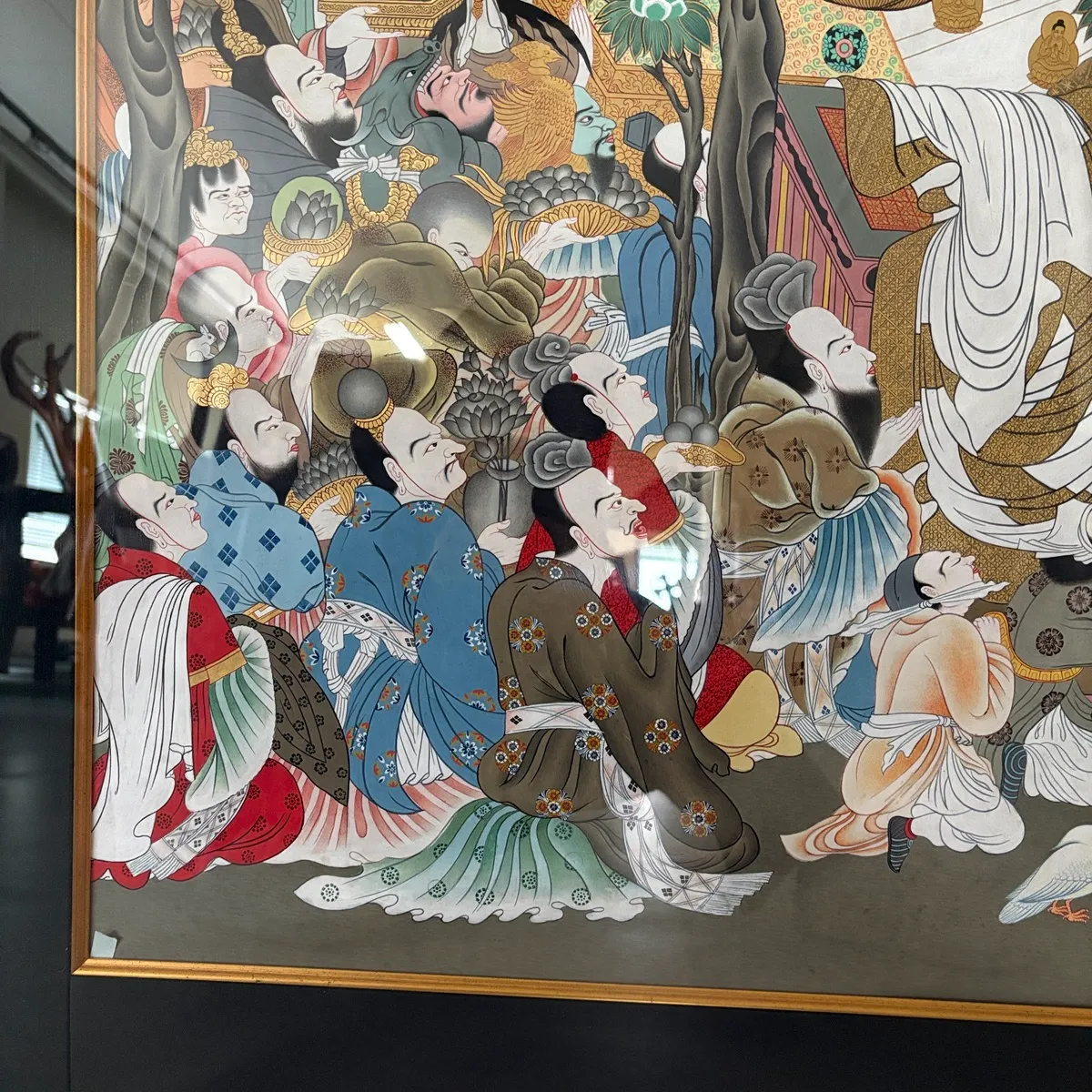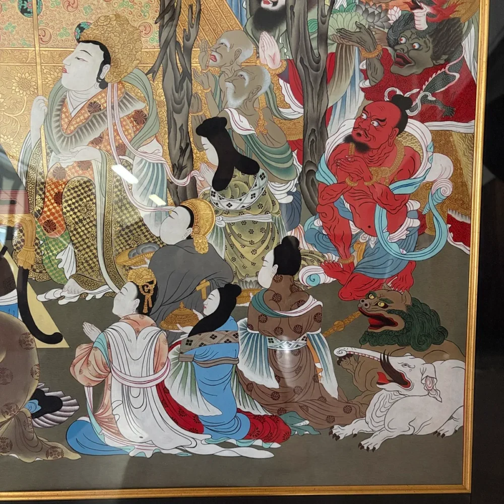 画面中央には釈迦の姿が配され、その周囲を多くの人物が取り囲む構成となっており、厳粛でありながらも物語性の強い印象を与えます。細部まで描き込まれた衣装や装飾からも、制作に相当な手間がかけられていることがうかがえます。