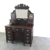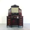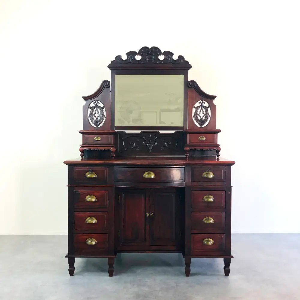 英国アンティークのドレッシングデスク。リースの装飾に囲まれた一面鏡。テーブル上部には左右に引き出しがあり、収納力も抜群。さらに、左右4つずつの引き出しと中央の引き出しが備わり、細やかな収納が可能です。中央下には両面扉を配置し、迫力のある造形美と実用性を兼ね備えたデザイン。スペードフットの脚がエレガントな印象を際立たせ、空間に品格を添えます。